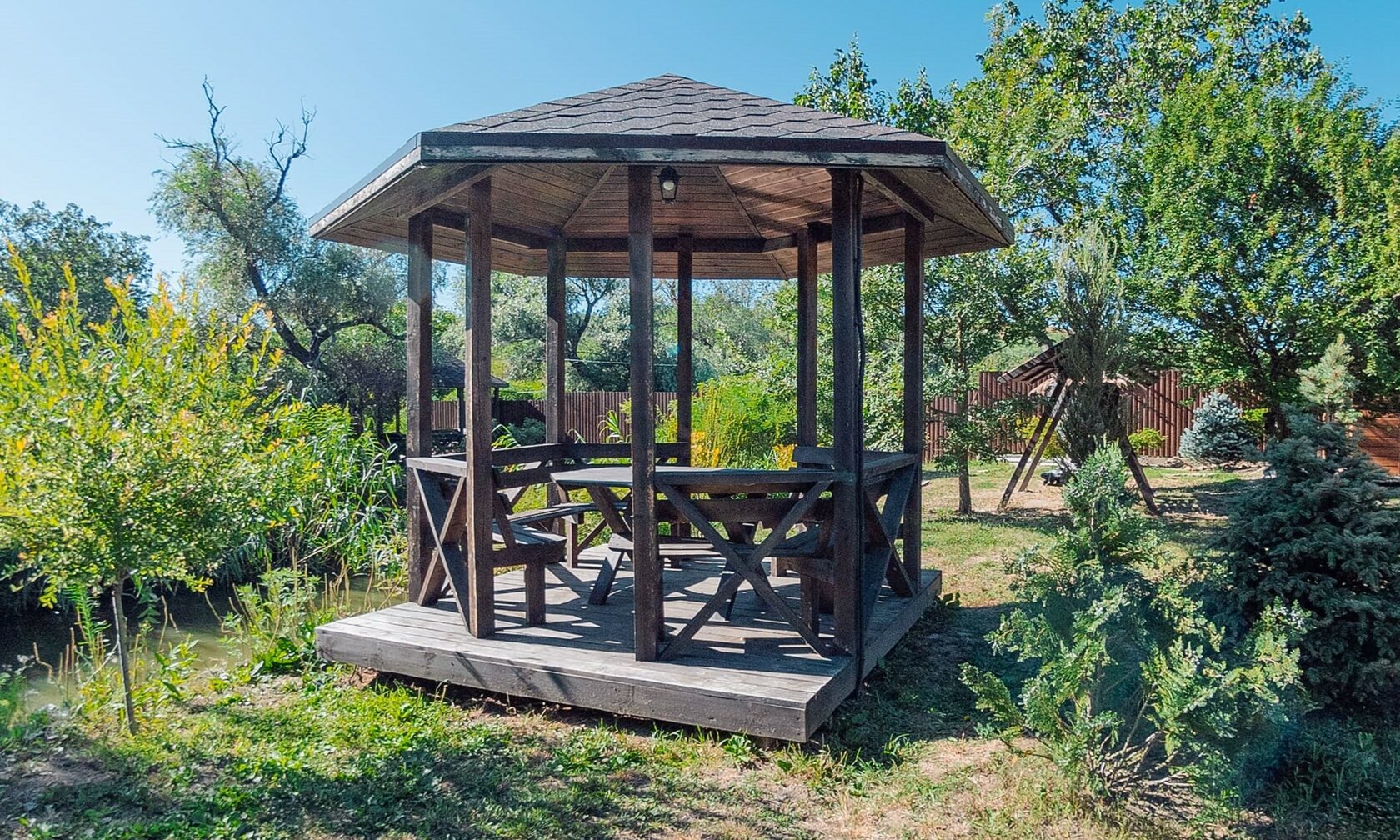 Банкетная беседка остекленена.