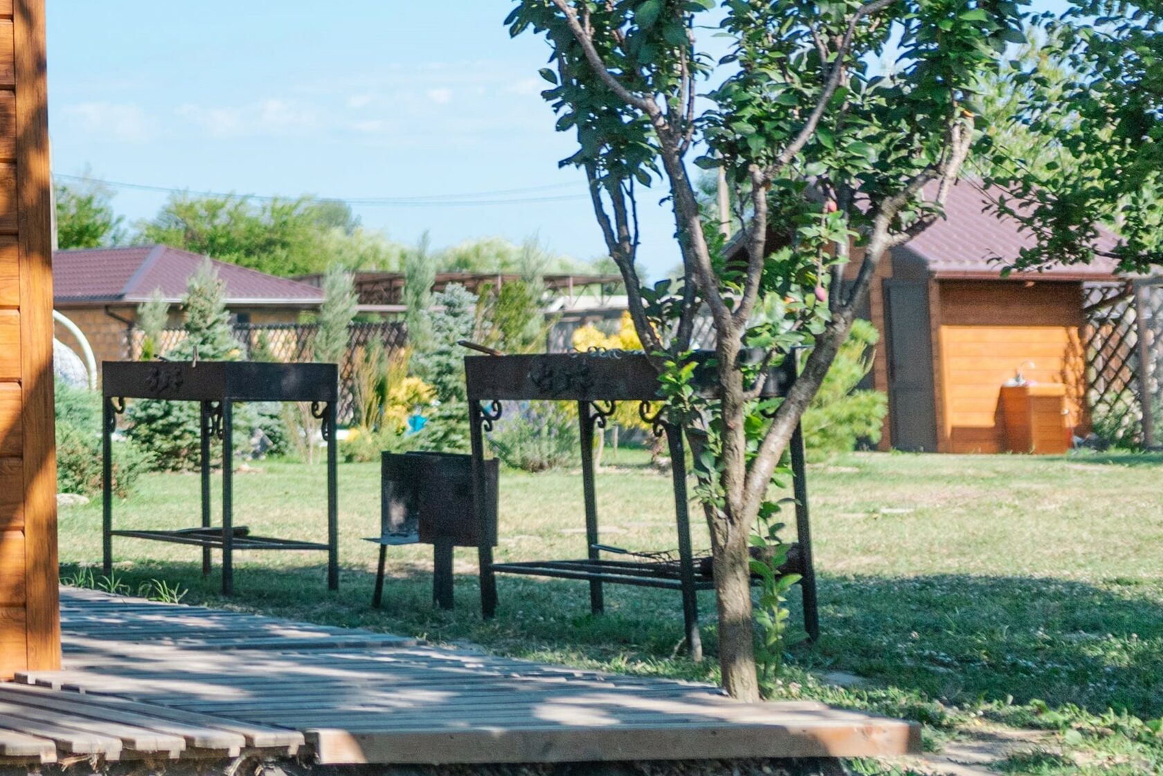 В беседке есть полный набор посуды, она оборудована сплит-системой и дровяной печью-камином, что сделает комфортным отдых в любое время года.